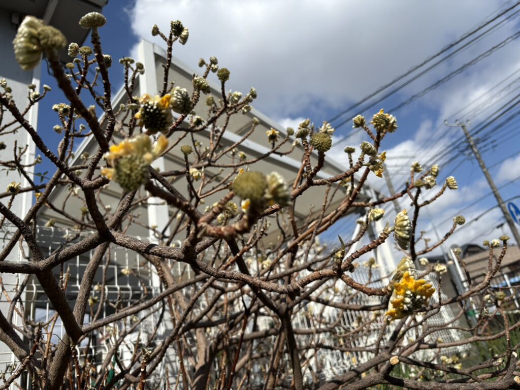 僕たちも植物を扱う商売ですので水不足が心配ですが、植物たちは日の長さを感じて徐々に芽吹きの季節を迎えています。写真は僕の家の裏にあるミツマタの花です。全ての枝が3つに分かれるこの植物は様々な花に先んじて3つに分かれた黄色い花を咲かせます。ほかにも水仙やミモザなどこの季節は黄色い花が印象に残ります。花が咲き始めると花粉を求めて虫たちも動き出します。まさに「雨水」の季節ですね。